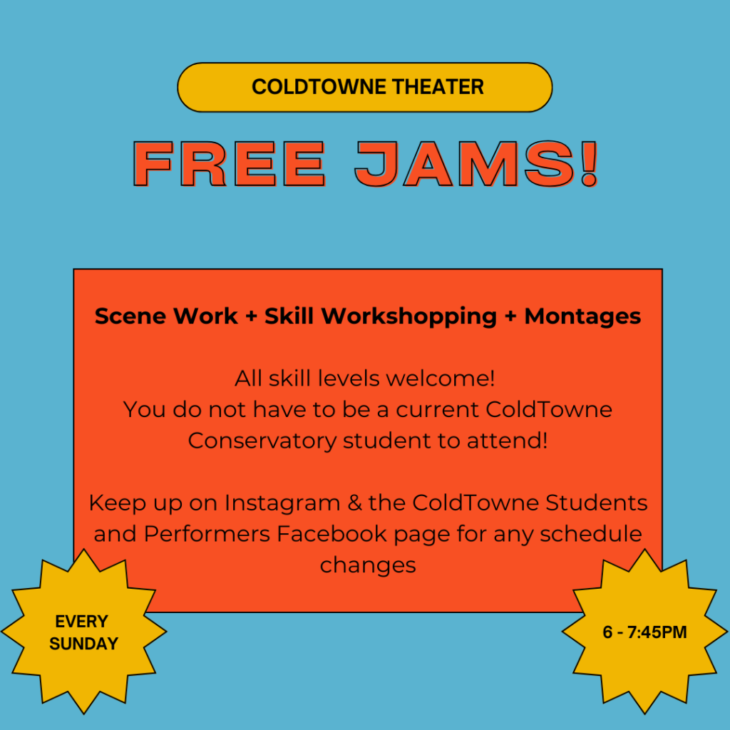 From 7:00pm to 8:30 we will do warm-ups and two-person scenes that are coached by experienced improv teacher and performer Drew Wesely. You’ll build the muscle memory of finding the Game Of The Scene and being playful and silly while Drew has your back making sure that scenes don’t cross into being uncomfortable. Then in the ColdTowne Jam you’ll form into teams and perform mock improv shows as if you were in front of an audience. You may try different styles of shows like you’ve seen onstage at improv comedy clubs, or play freeform montages following the funny!
